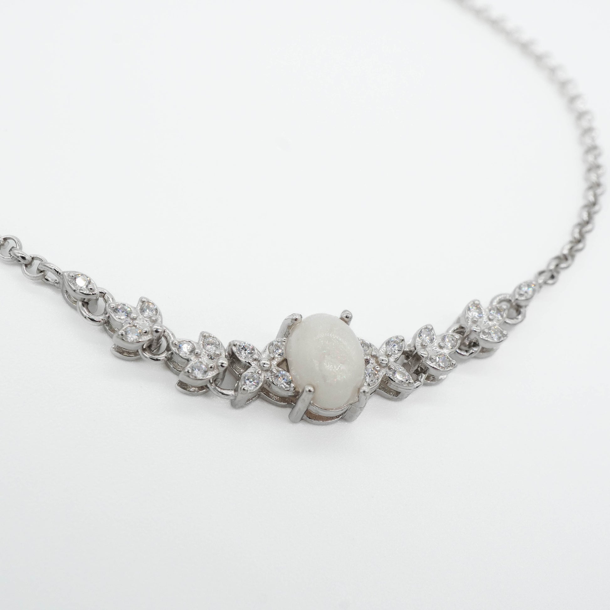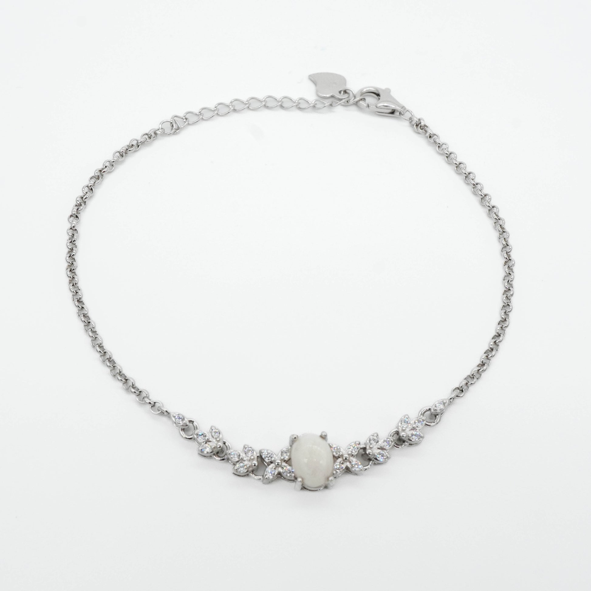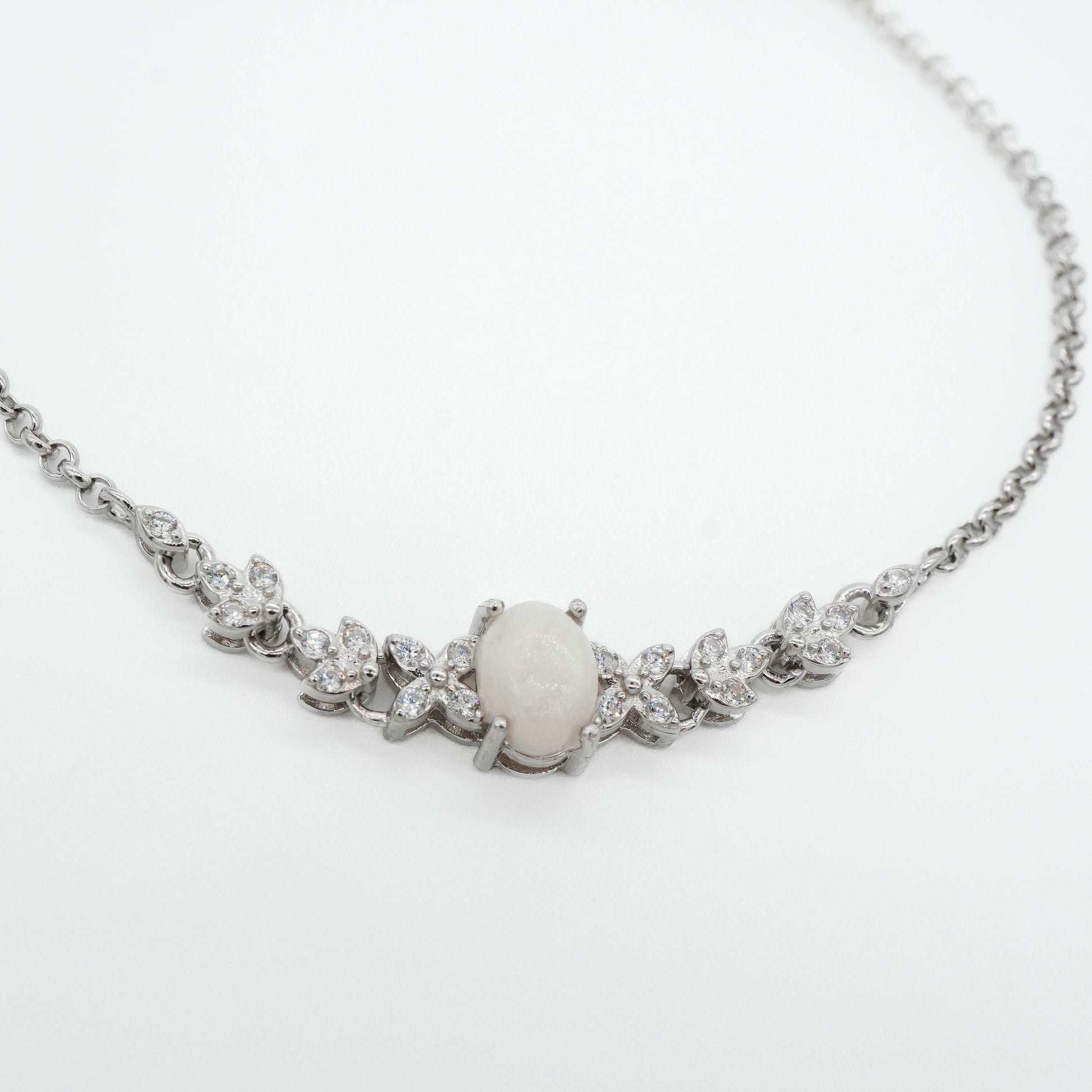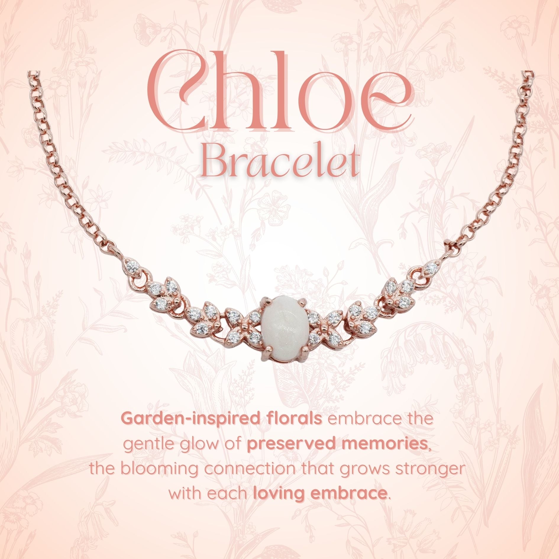 This stunning bracelet features a luminous 5x7mm cabochon breastmilk stone, expertly crafted from your own preserved milk. Delicate floral elements dance along either side of the central stone, each petal and leaf meticulously set with brilliant diamond simulants.