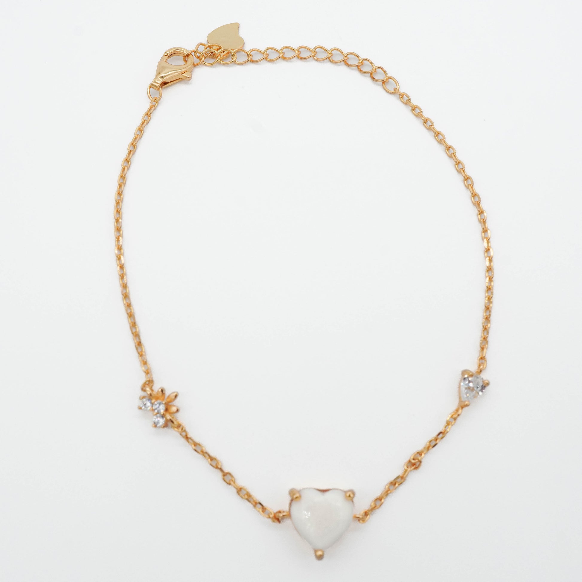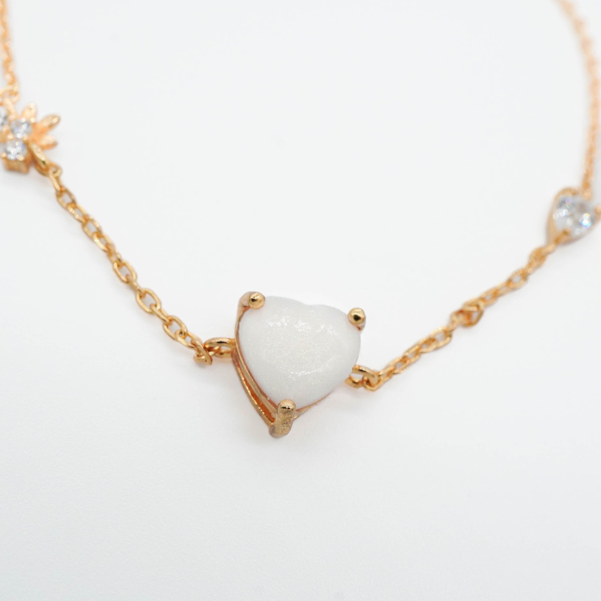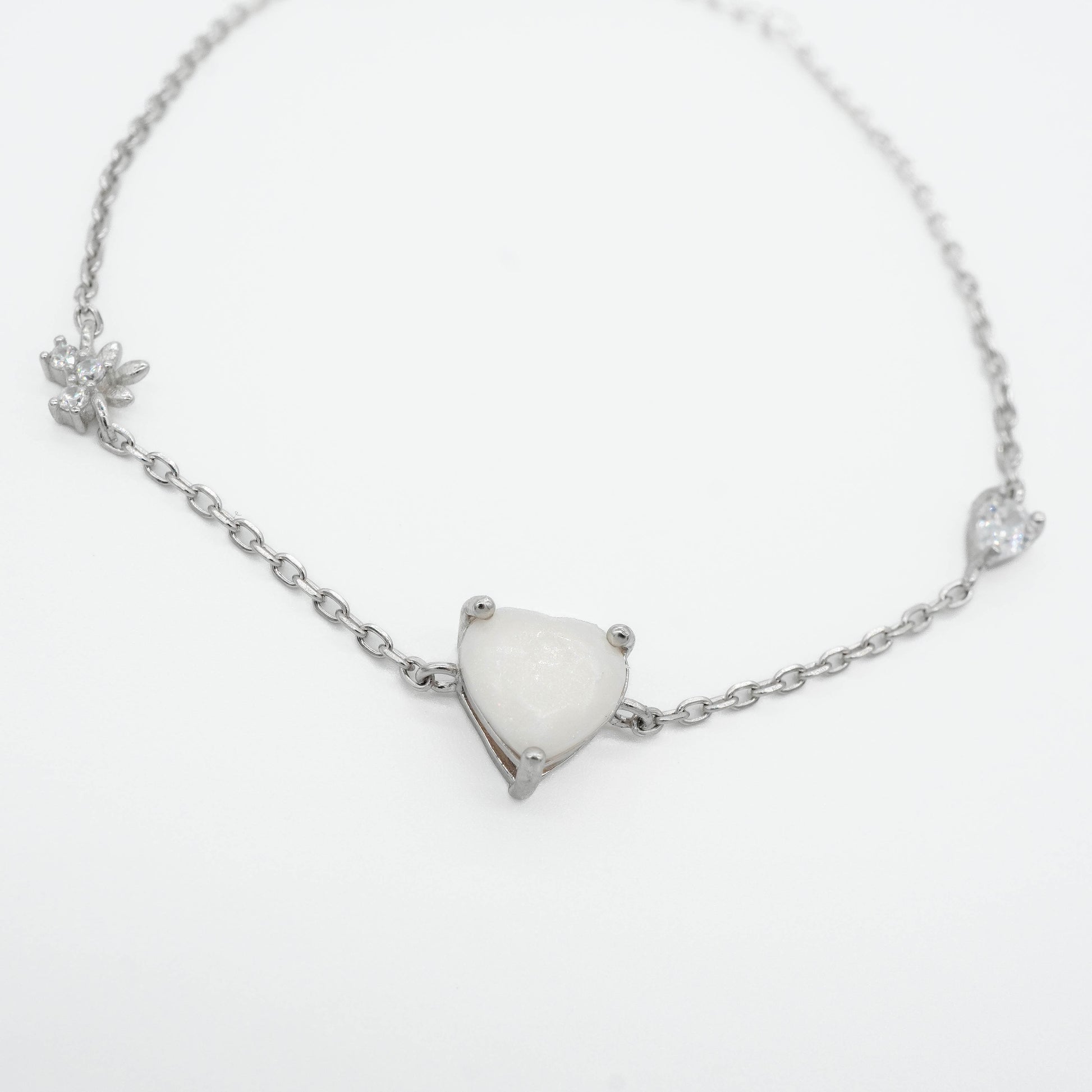 This delicate bracelet features a precious heart-shaped breastmilk stone as its tender centerpiece. Flanking this meaningful centerpiece are sparkling star-shaped crystal clusters, each one representing the bright constellation of joy. The fine chain creates an understated elegance that allows the heart stone to rest gently against your skin, close to your own heart where those precious memories live.