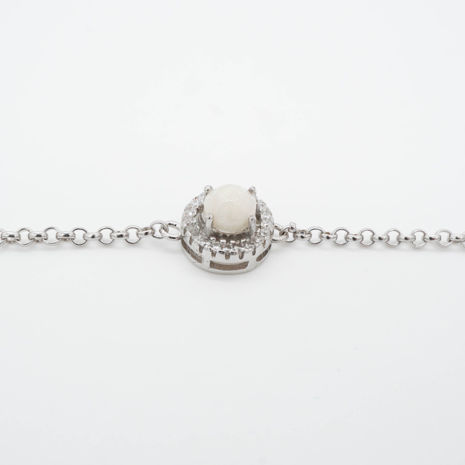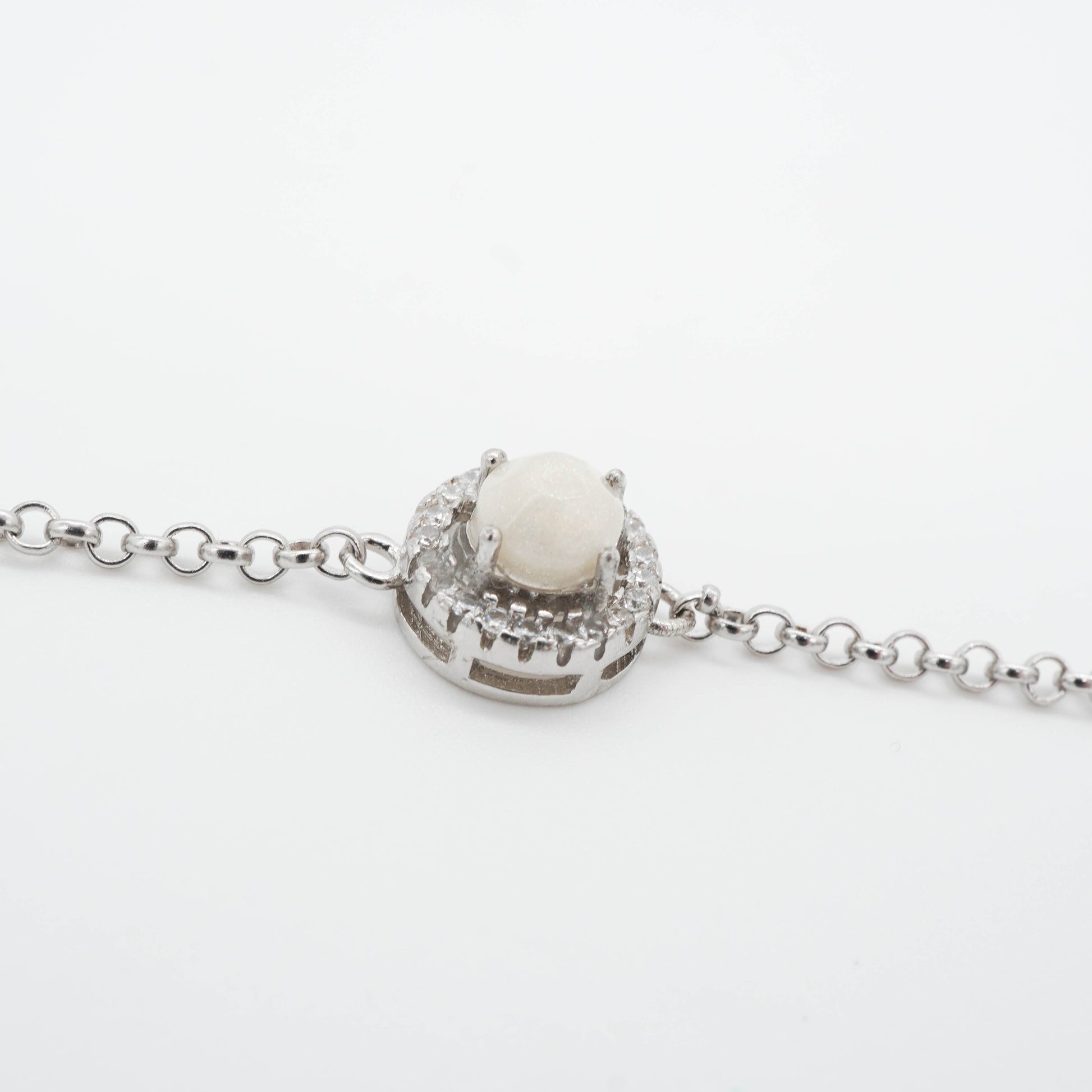 At the heart of this exquisite bracelet shines a 5mm round classic cut breastmilk stone, meticulously preserved and polished to a soft, luminous glow. Its smooth, domed surface captures light beautifully, reflecting the nurturing warmth of motherhood with every movement.